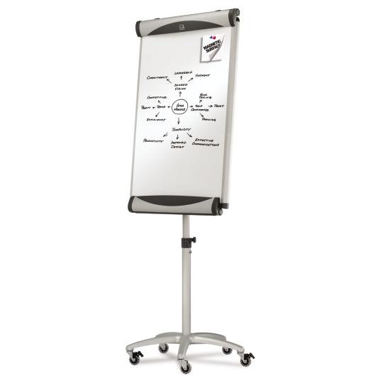 Ultra-durable, ultra-smooth 27" x 41" mobile presentation easel with DuraMax® porcelain surface that will not scratch, dent, stain or ghost. Delivers superior performance when collaboration is needed in high-profile, heavy-use office environments. Magnetic surface doubles as bulletin board. Easy-to-clean writing surface requires minimal use of Quartet® cleaning solutions. Adjustable hooks and clamp hold standard-sized flipcharts for easy sheet tear-away meeting notes. Smooth-rolling 5-caster star-base wheels lock firmly in place for total control and mobility. Flexible spring-loaded height adjuster moves from 67" to 77" for optimal height. Includes spacious folding accessory tray and 4 assorted Quartet® whiteboard markers. Sleek Euro™ design with matte aluminum finish for maximum style and durability. 100% Satisfaction Guaranteed.